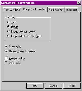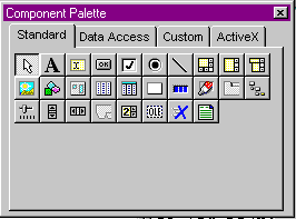 In the Form designer, the Component Palette will display "Standard", "Data Access", "Data Buttons", "Custom" and "ActiveX" tabs, each having images and/or text (depending on your preferences - see below) for each object.