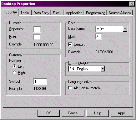 The 'Country' tab is aimed at settings that affect developers using dBASE and applications that will be used outside of the US.