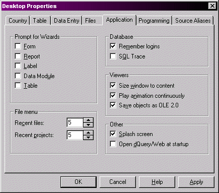 A couple of areas of interest are the "Wizards" section -- by default dBASE will prompt you if you wish to use the Wizards when you choose to create a new table, form, etc. If you uncheck these, it will not prompt you anymore and take you straight to the design surface. This is a matter of preference, obviously, but most developers stop using the Wizards after awhile.