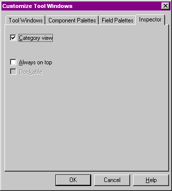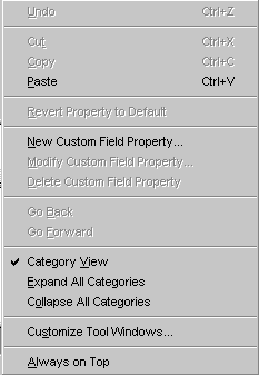 Next to this are three buttons that affect the layout of the inspector. The first is a toggle button -- it is either up or it is down (you can use this functionality in your own forms by using the toggle property of the pushbutton object -- see HOW TO on Form Controls in the Knowledgebase). If it is "Down" (which is the default), you are in "Category" view. What this means is that you see the properties grouped by categories. Some objects have categories, some do not. Most of the UI objects (Forms, objects that can be used on Forms, and the same for Reports, aas well as most of the data objects). However, you may be more comfortable with looking at the properties in an alphabetical listing. Click on this button, and it moves to the "Up" state, which is an alphabetical view.