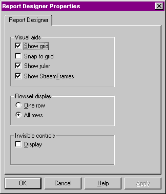 Bug Warning: If you use any metric (a property of the report) other than the default (twips), the size tools may give you some odd results due to some bugs in the conversion from twips to other metrics. Sometimes using the sizing options will end up with all of your controls being, for example, 3000 inches wide -- which might be correct as 3000 twips, but not in inches (which is what the designer will attempt to display). Be careful, and consider yourself warned. In dBASE, many of these issues have been resolved, but if you find a reproduceabel case, please report it to us ..