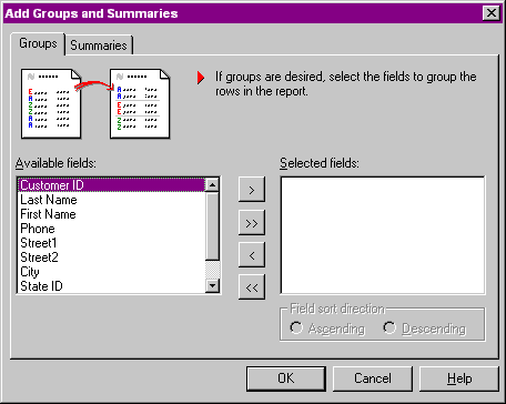 This option allows you to define groups and summaries. The option reads "Add Groups and Summaries ..." -- this brings up a new dialog.