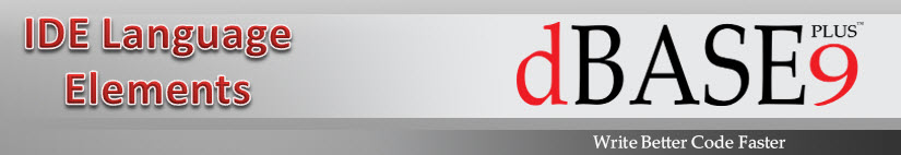 This section of the Language Reference describes language elements that you use within the dBASE Plus integrated development environment (IDE) to programmatically create, modify, compile and build applications.