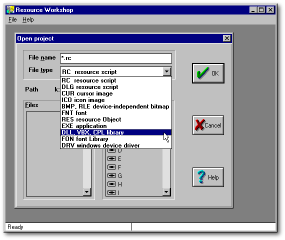 From the File menu, select 'Open project…'. The first time you are using RW, the combobox displays 'RC resource script' as the file type by default. Use the combobox to select 'DLL, VBX, CPL library' as illustrated in the image below. In the lower right rectangle, double-click on the appropriate drive and folder until you get to the folder where you stored the DLL created in the first step. Select 'MyApp.dll' in the lower left rectangle and click the OK button.