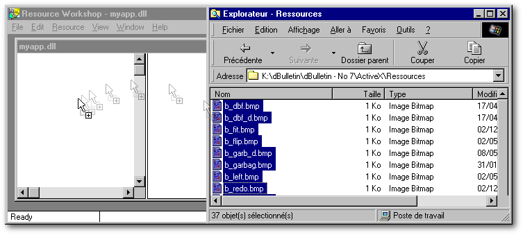 8 - Load M$ Explorer. Select all the BMPs (and only the BMPs) you would like to add to your DLL. Drag'n drop them in the left pane of RW. Note: I was not very lucky while I tried to add both BMPs and ICOs at the same time in a 32-bit DLL. I could add them in the 16-bit DLL, but when I tried to transfer them to the 32 bit DLL, it was impossible to save the latter without crashing. My suggestion would thus be to add only BMPs for now.
