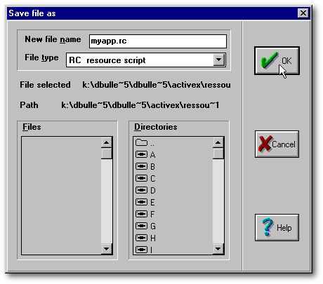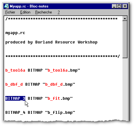 12 — Optional: The resource file you have just created is a simple ASCII file. If you want to rename your resources, load 'myapp.rc' in an editor (for example, Notepad) and do it. Personally, I like to give to each resource the name of its corresponding BMP. So I just copy and paste the name of the image (without its suffix!). Don't reorder since your resources will always be displayed in alphabetic order whatever you do. Save the resource file.