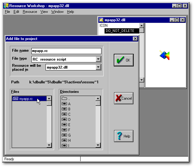 13 — Load MyApp32.dll in RW. It contains only an icon called 'Do_not_delete'; don't touch it since it seems to be necessary to permit the RW to produce a DLL compatible with VdB7.