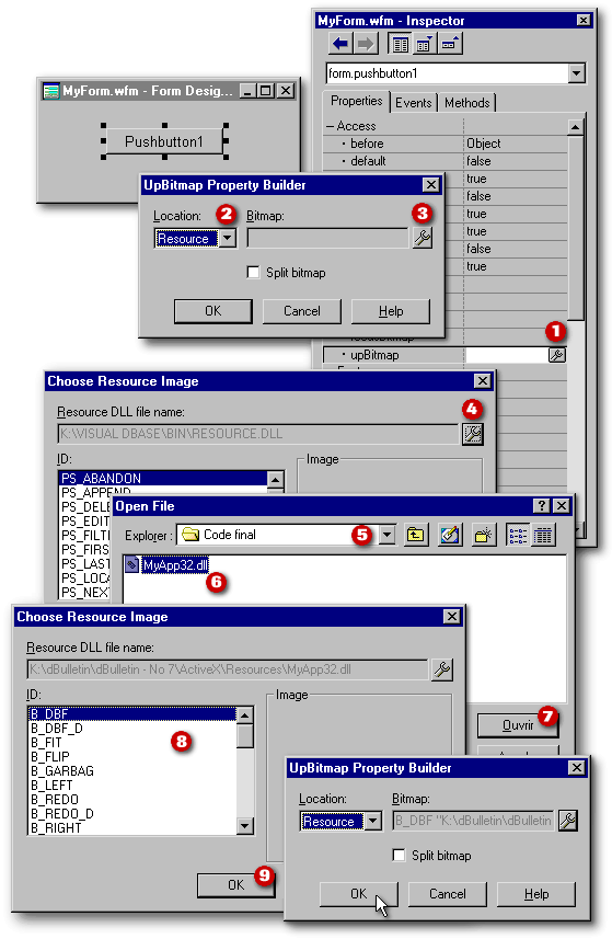 Whatever the version you are using, the Form designer will not allow you to select an icon resource when there is only one in the DLL; in the previous image, the “step #9” OK button is then disabled. But if the DLL contains at least two icon resources, the OK button is enabled. Under VdB 5.x, the Form designer can thus be used to link an icon property to an icon resource from any 16-bit DLL which contains at least two icons.