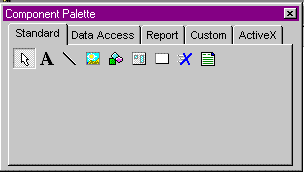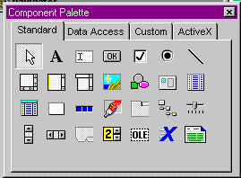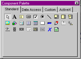 In the Form designer, the Component Palette will display "Standard", "Data Access", "Data Buttons", "Custom" and "ActiveX" tabs, each having images and/or text (depending on your preferences - see below) for each object.