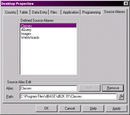 New to dBASE. The Source Aliases tab gives you the area to define your Source Aliases. The image shown has the "dUFLP" alias defined, which is used for the dBASE Users' Function Library Project, in the Knowledgebase (see the whats.new and/or readme.txt files contained in the library for instructions). The other three aliases shown are the ones that are installed with dBASE.
