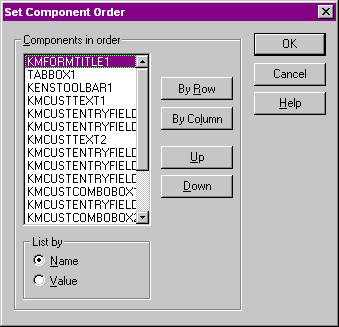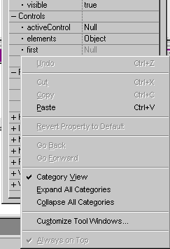 Next to this are three buttons that affect the layout of the inspector. The first is a toggle button -- it is either up or it is down (you can use this functionality in your own forms by using the toggle property of the pushbutton object -- see HOW TO on Form Controls in the Knowledgebase). If it is "Down" (which is the default), you are in "Category" view. What this means is that you see the properties grouped by categories. Some objects have categories, some do not. Most of the UI objects (Forms, objects that can be used on Forms, and the same for Reports, aas well as most of the data objects). However, you may be more comfortable with looking at the properties in an alphabetical listing. Click on this button, and it moves to the "Up" state, which is an alphabetical view.