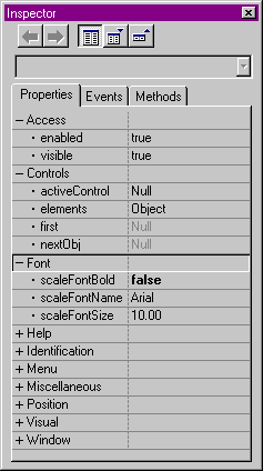 The Inspector has three tabs, one each for Properties, Events and Methods. If