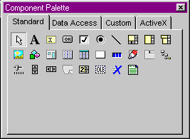 In the Form designer, the Component Palette will display "Standard", "Data Access", "Data Buttons", "Custom" and "ActiveX" tabs, each having images and/or text (depending on your preferences - see below) for each object.