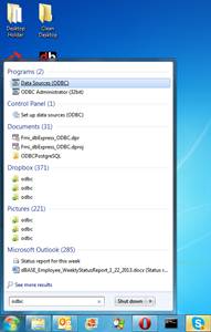 If you are in Windows XP, Vista, or Win 7, click the Start button and then Type in ODBC in the Search or Run edit boxes. This should lead to Data Sources (ODBC) being displayed in the search results, click on that item to continue.