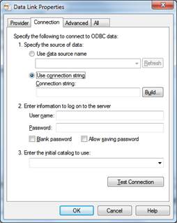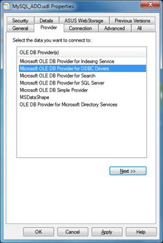 Now select the ODBC provider and click the next button. Note: This could take you to security, however, you want to click on the Connection tab if the security panel looks correct. |