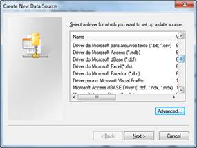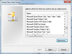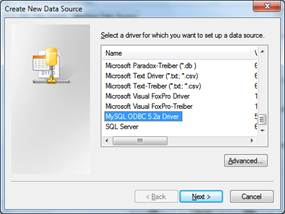 This can be a very long list. Find the Driver you are looking for and select it. In this example we will use the MySQL ODBC driver, then press the Next > button to continue |