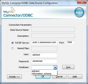 Now, put in the TCP/IP address of the database, the Port, User Name, Password and click the Database dropdown to see the databases. If it shows databases you are connected. After picking the database click the Test button to ensure it. |