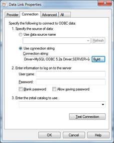 Since MySQL only supports ODBC and not OLE DB, we have to configure an ODBC data source in the Windows OS for the connectivity.