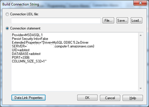 Notice now that the full connection string is located in the Connection statement area. Press the OK button to continue. |