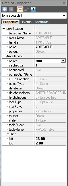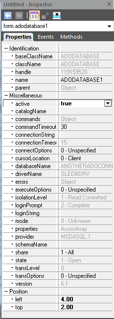 Set the Database Name property to the property we defined in the UDL or Database Connection String process that was completed earlier. Then set the Active property to True. |
